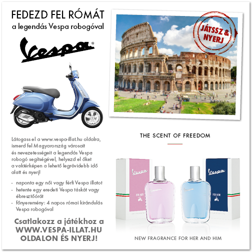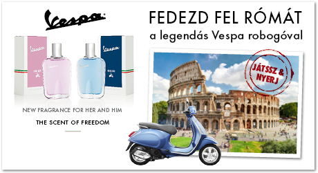 Ha szeretnél új Vespa illatot, eredeti Vespa ébresztőórát, Vespa táskát nyerni, vagy egy 4 napos 2 személyes római kiránduláson részt venni egy Vespa robogóval, vegyél részt a Vespa illat nyereményjátékán!